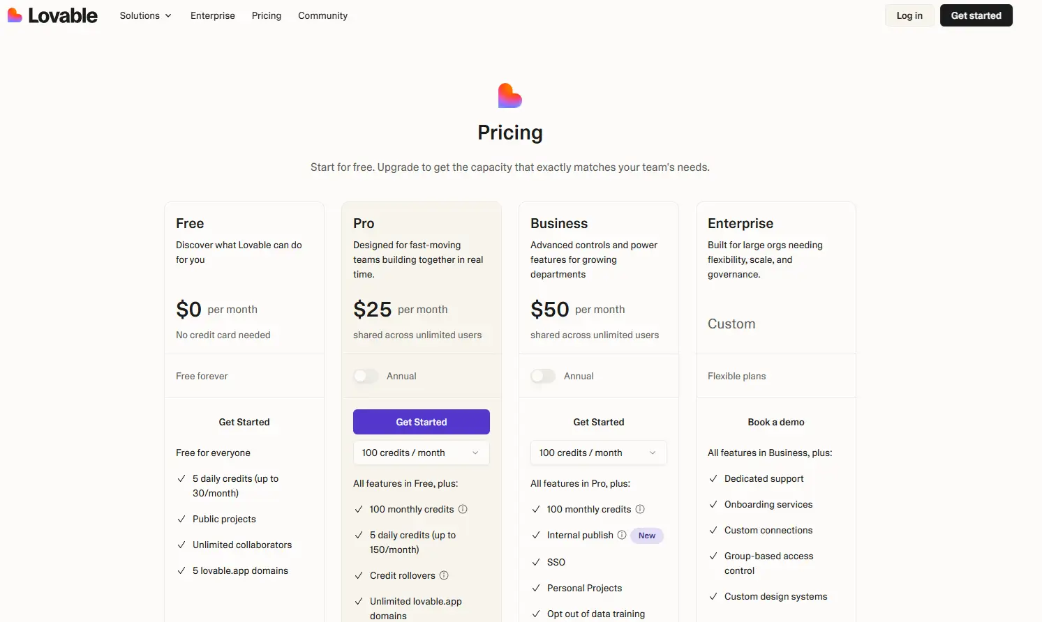 | Lovable Plan (Billed Annually) | Price/Month | Message Credits (Development) | Team Access & Features |
