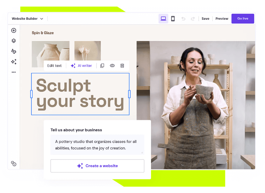 Hostinger’s Website Builder (formerly Zyro) combines ease of use with performance-focused hosting. It’s an all-in-one package that’s budget-friendly but still packed with useful tools.